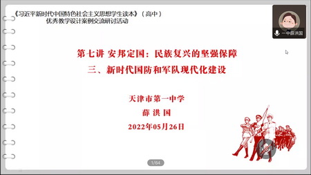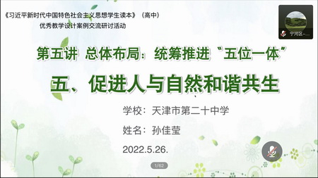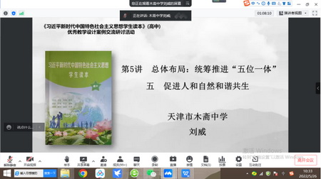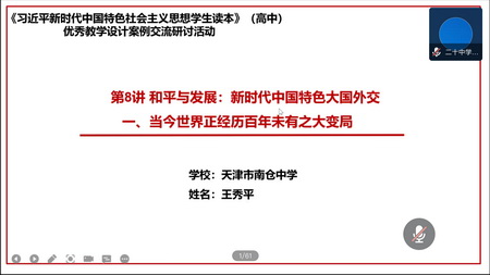 天津市第一中学薛洪国以《新时代国防和军队现代化建设》、天津市第二十中学孙佳莹以《促进人与自然和谐共生》、天津市南仓中学王秀平以《当今世界正经历百年未有之大变局》、天津市木斋中学刘威以《促进人与自然和谐共生》为题进行了教学设计案例分享交流。